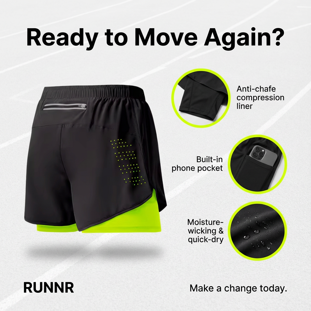 Most running brands design for elites — we design for real runners. Every feature in our shorts is built to solve everyday problems: bouncing phones, chafing, sweat buildup, heat, storage, and price. RUNNR focuses on practical performance, not hype.